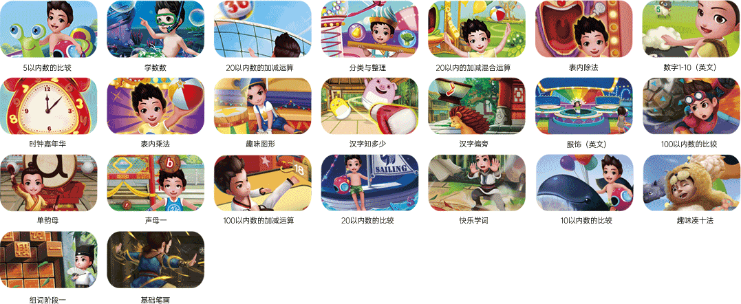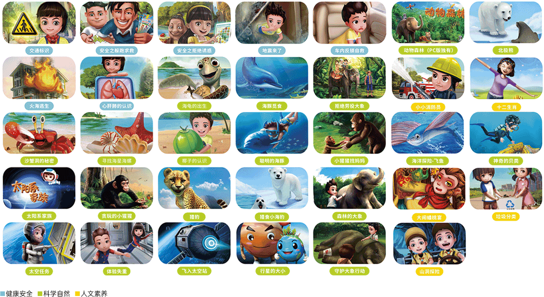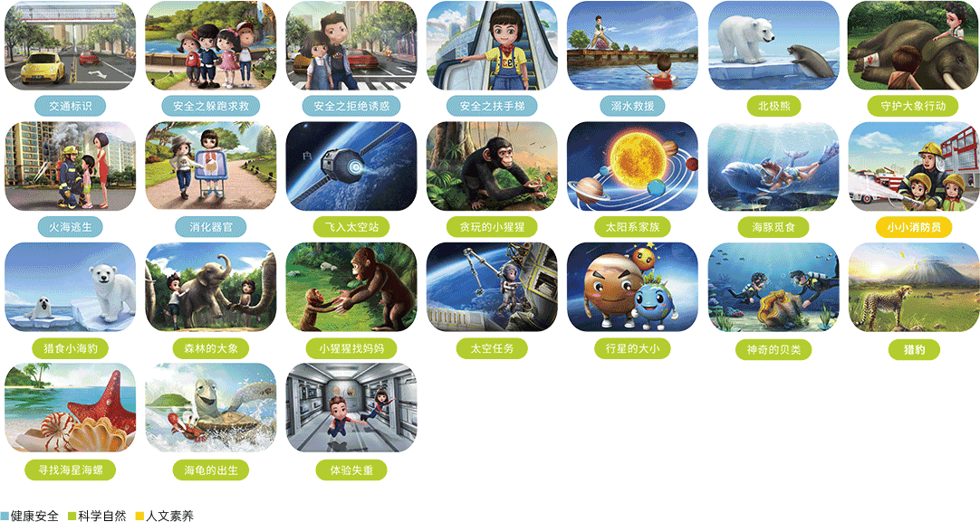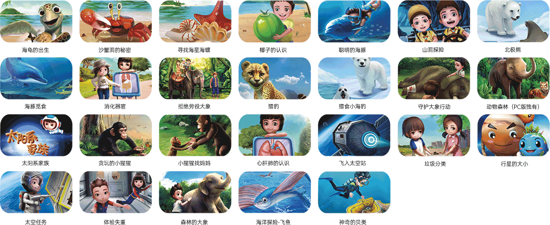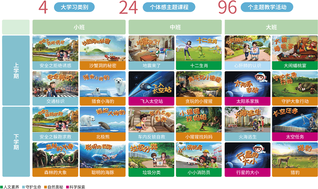 由体感课程、电子教学资源、教师用书和 儿童绘本和PC/安卓体感学习机,共五大部分内容组成。 主要分成“主题教学”和“自主活动”两大板块。