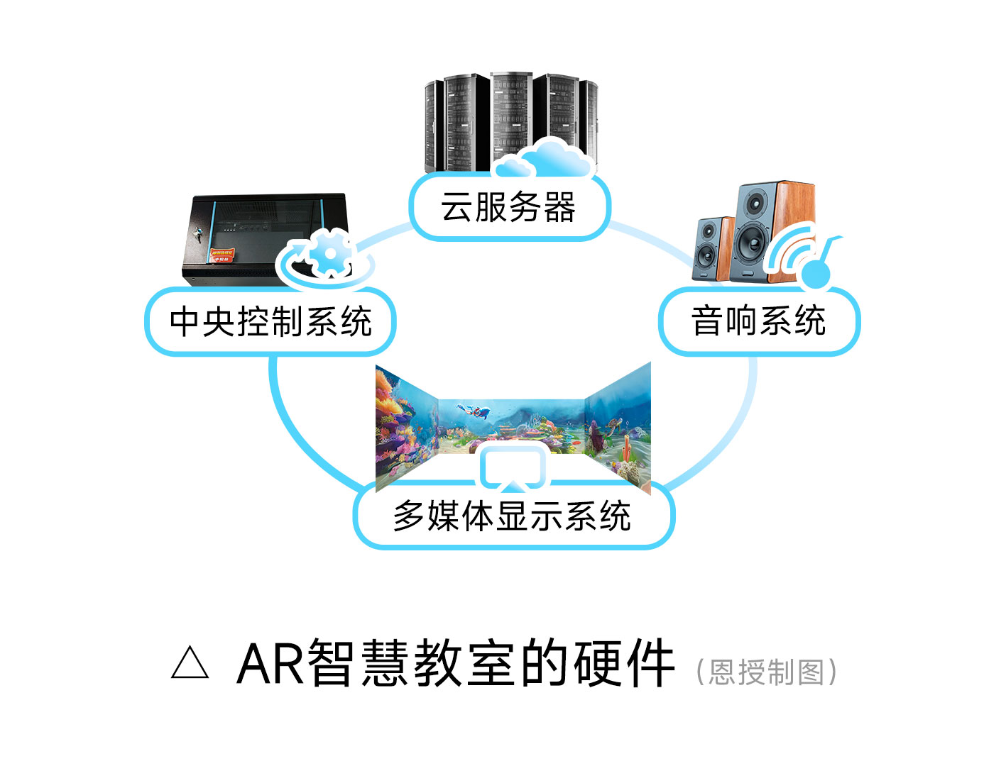 云服务器是用来存储和运算教学系统和课程内容。中央控制系统,是将电脑、投影机、音响等子系统集成在一起,实现智能化操作。多媒体显示系统,是将多台投影机或显示屏融合在一起,实现情景式、沉浸式学习的氛围。 如果将AR智慧教室比喻成一个人的话,云服务器、中央控制系统、多媒体显示系统、音响系统就相当于人的骨骼、肌肉、五官,这些基本元素构成了人的躯壳。