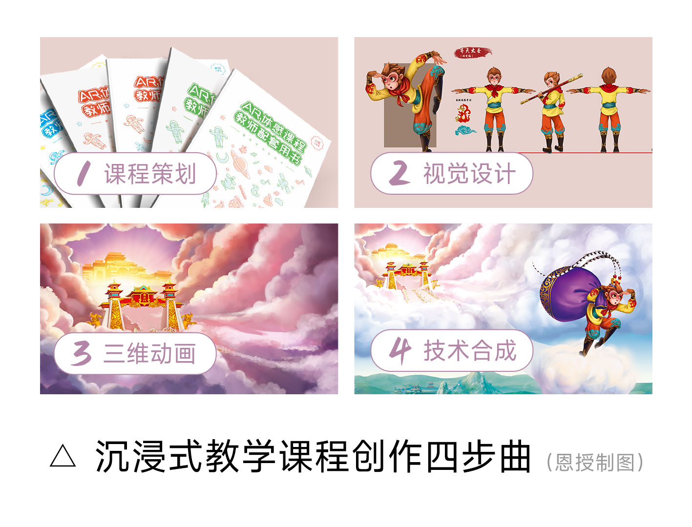 沉浸式教学课程这么重要,它们是怎样创作出来的呢?据了解,沉浸式教学课程的创作大致分成四个步骤:课程策划、视觉设计、三维动画、技术合成,下面简单介绍一下。
