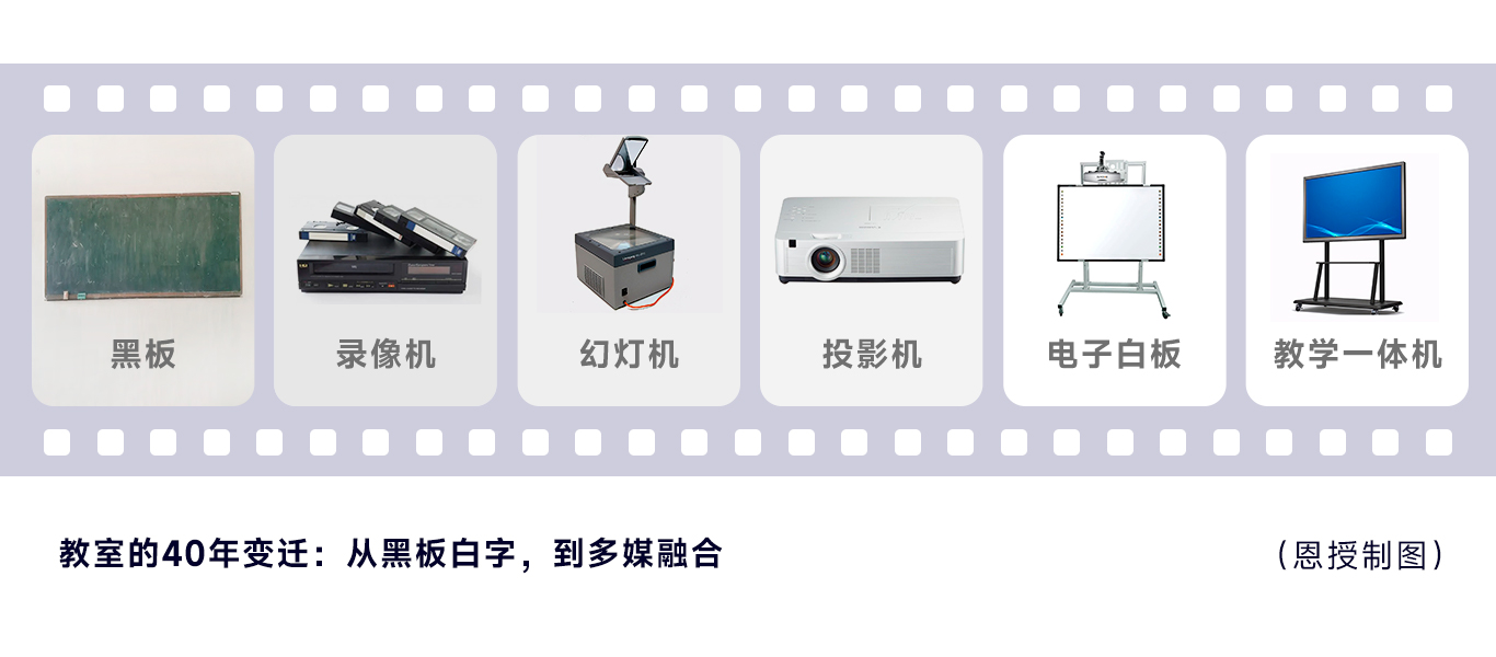 20世纪80年代之前,一张讲台,一块黑板,一盒白笔是那个年代的教室的标准配置。上课的时候,老师用白笔把知识要点写在水泥黑板上,学生们做好笔记之后,老师就擦掉再写上新的内容。擦黑板的时候会“雪花飞舞”,一节课下来,老师和坐在前面两排的同学已经是“白发苍苍”了。 到了80年代,录音机、录像机和幻灯机陆续应用在课堂教学。到了90年代,投影机开始应用在课堂教学。当时,录像机、幻灯机、投影机属于电化教学仪器。因此,80年代-90年代,就被称为“电化教学”时代。 到了2000年,开始进入“教育信息化1.0” 时代,技术更先进,功能更强大的电子白板和教学一体机先后进入教室,这些新型教育装备里面配有一些互动多媒体课件,很受学生们的喜爱,也成为了老师们非常得力的“助教”。